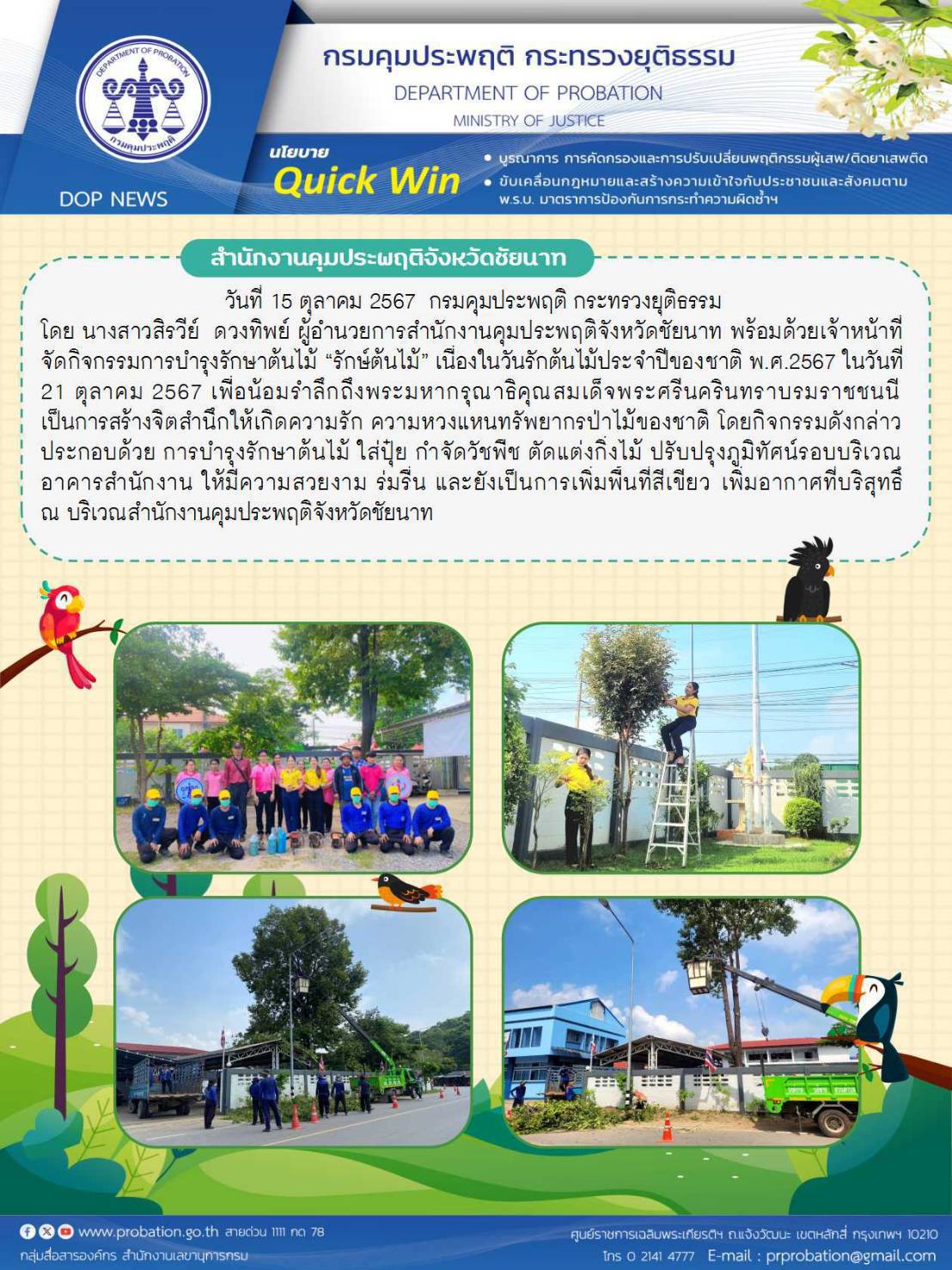 สำนักงานคุมประพฤติจังหวัดชัยนาท จัดกิจกรรมการบำรุงรักษาต้นไม้ ”รักษ์ต้นไม้” เนื่องในวันรักต้นไม้ประจำปีของชาติ พ.ศ. 2567