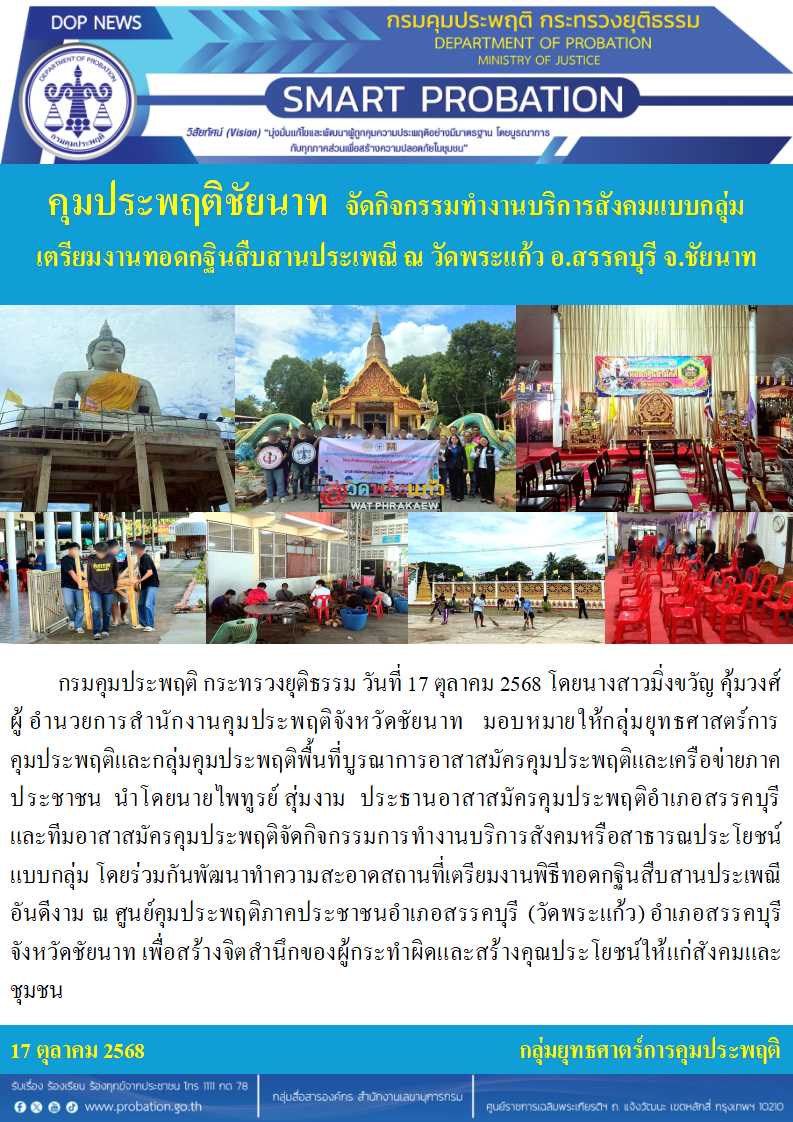 วันที่ 17 ตุลาคม 2568 นางสาวมิ่งขวัญ คุ้มวงศ์ ผู้อำนวยการสำนักงานคุมประพฤติจังหวัดชัยนาท มอบหมายให้กลุ่มยุทธศาสตร์ฯและกลุ่มคุมประพฤติพื้นที่ บูรณาการประสานความร่วมมือกับอาสาสมัครคุมประพฤติและเครือข่ายภาคประชาชน นำโดยนายไพทูรย์ สุ่มงาม ประธานอาสาสมัครคุมประพฤติอำเภอสรรคบุรี และทีมอาสาสมัครคุมประพฤติ จัดกิจกรรมการทำงานบริการสังคมหรือสาธารณประโยชน์แบบกลุ่ม โดยร่วมกันพัฒนาทำความสะอาดสถานที่เพื่อเตรียมงานพิธีทอดกฐินสืบสานประเพณีอันดีงาม ณ ศูนย์คุมประพฤติภาคประชาชนอำเภอสรรคบุรี (วัดพระแก้ว) อำเภอสรรคบุรี จังหวัดชัยนาท เพื่อสร้างจิตสำนึกของผู้กระทำผิดและสร้างคุณประโยชน์ให้แก่สังคมและชุมชน โดยมีผู้เข้าร่วมกิจกรรมรวมจำนวนรวม 50 คน